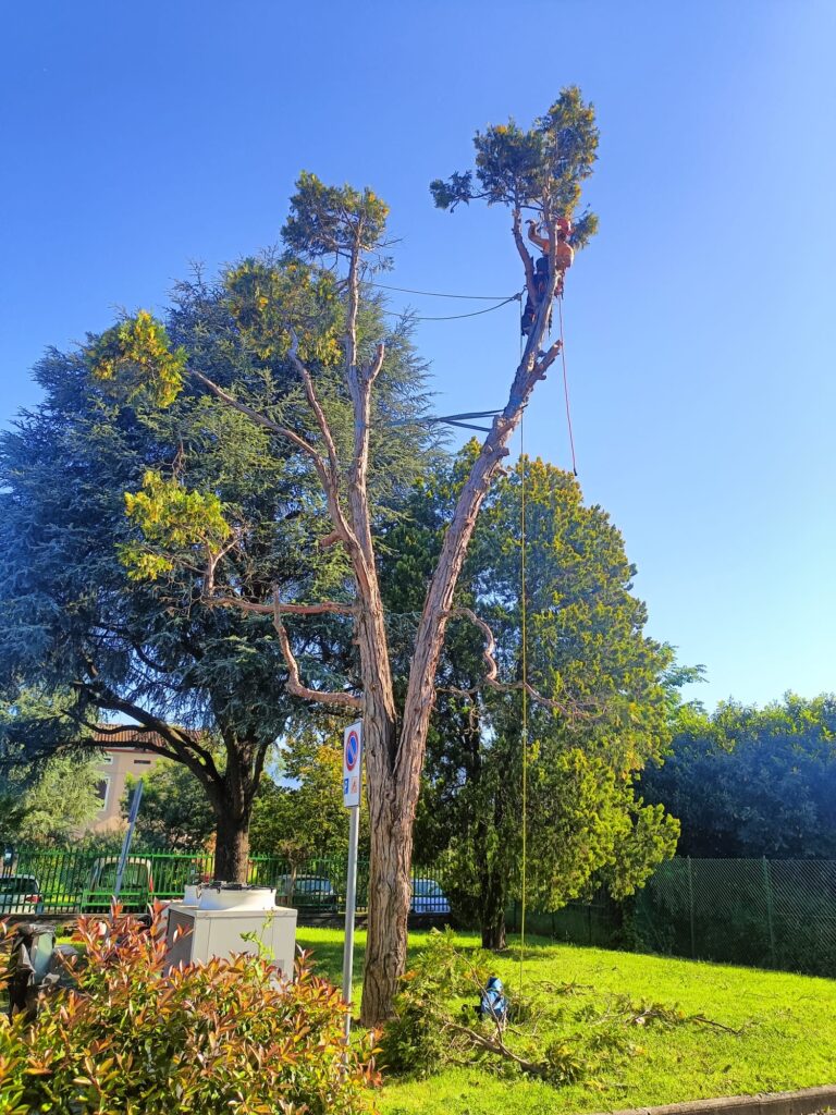 Questa metodologia, che prevede l’arrampicata e la discesa controllata dall’albero tramite corde e imbracature, consente di operare in totale sicurezza anche negli spazi più angusti, dove un abbattimento tradizionale da terra non è possibile.